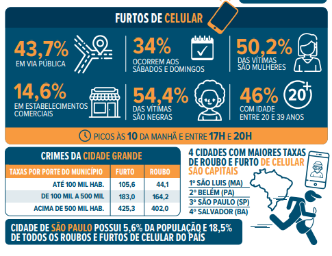 Embora o país tenha registrado queda geral nas ocorrências desse tipo de delito, o relatório mostra uma concentração preocupante em grandes centros e capitais com fortes desigualdades sociais, fragilidades na prevenção e baixa integração entre polícias, operadoras e o sistema de justiça para rastrear, bloquear e devolver aparelhos.