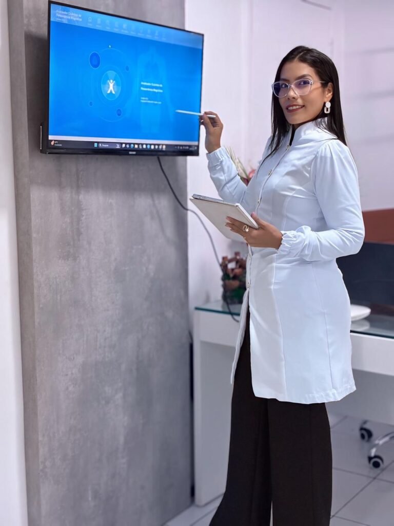 Na foto, Mayara Castro utiliza o aparelho de bioressonância — um recurso moderno que auxilia na identificação de padrões energéticos e funcionais do organismo, sendo possível atuar na prevenção e no reequilíbrio do corpo, mente e emoções
